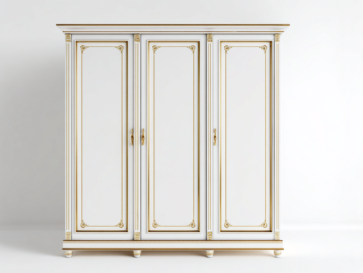 Armadio a 3 ante dallo stile classico, progettato per ambienti eleganti e raffinati. Le linee decorative e i dettagli dorati donano un aspetto ricercato, rendendolo adatto a camere da letto tradizionali o spazi arredati con gusto classico. La struttura offre una soluzione funzionale per l'organizzazione quotidiana.